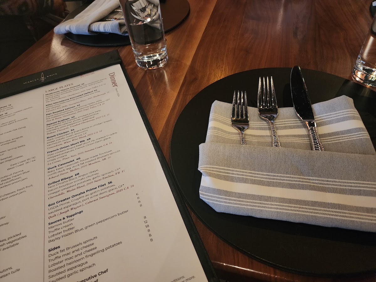 Flame broiled 14 oz ribeye, roasted fingerling potatoes, marsala shallot butter, garlic spinach
